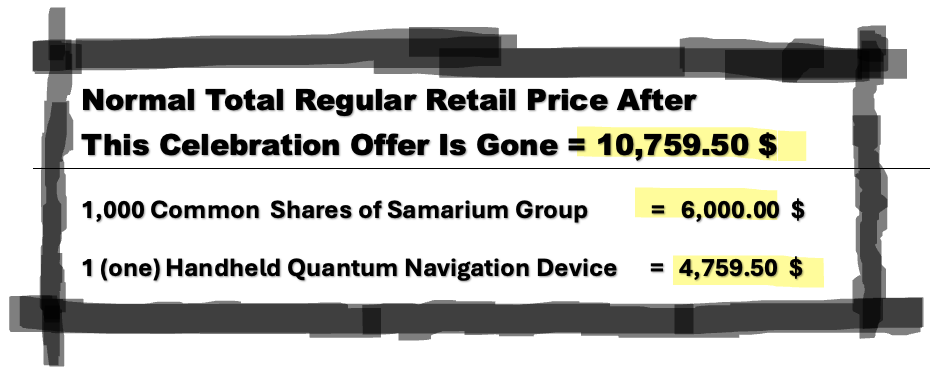 - Here is how the math works: buy Common Shares of Samarium Group for at least 1,000 USD$ and get the 4,750 USD$ quantum navigation device for free, once ready for shipping.