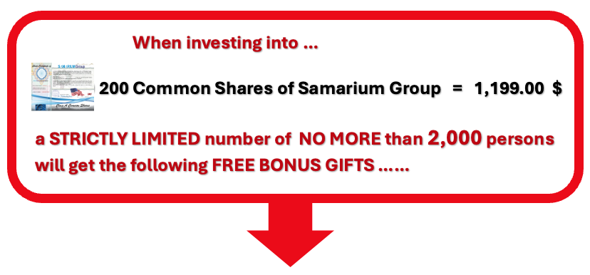 - Offer valid ONLY during a LIMITED time. Offer ends once Samarium Group files the S-1 statement with the SEC or the supply limit is reached. A date for the S-1 filing is not yet known but the company will make all efforts to do this as soon as possible. The S-1 filing can be seen – once filed – on the website of the SEC at www.sec.gov, and an announcement will be made on our website and by email to whoever has registered a valid email address with us.